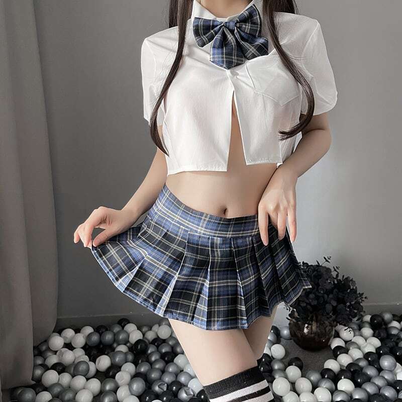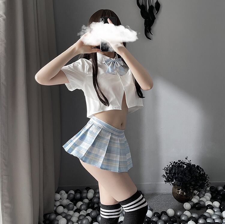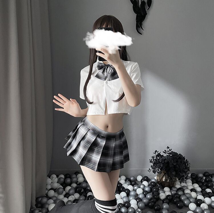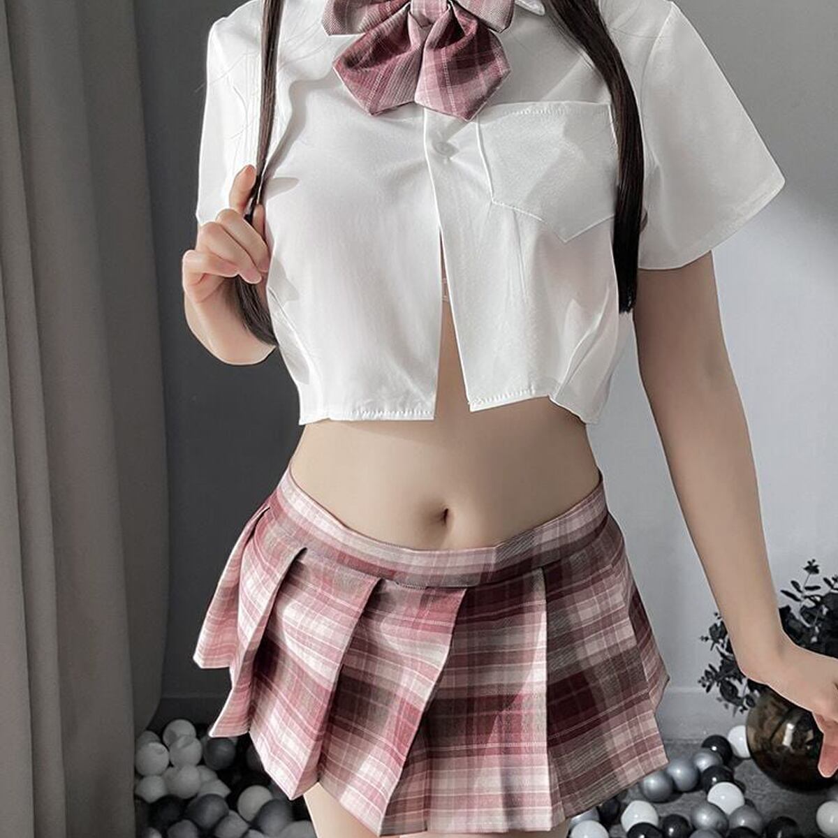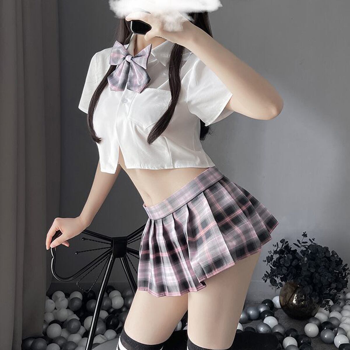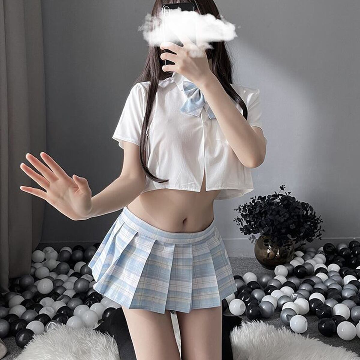 清楚なのに大胆。ショート丈シャツ×超ミニプリーツスカートの「JK風制服コスチュームセット」です。
