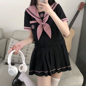 セーラー服 レディース 女子高生 JK 学生服 日系 正統派 スクール セットアップ 黒 半袖 夏服 リボン付き ポリエステル 清楚 刺繍