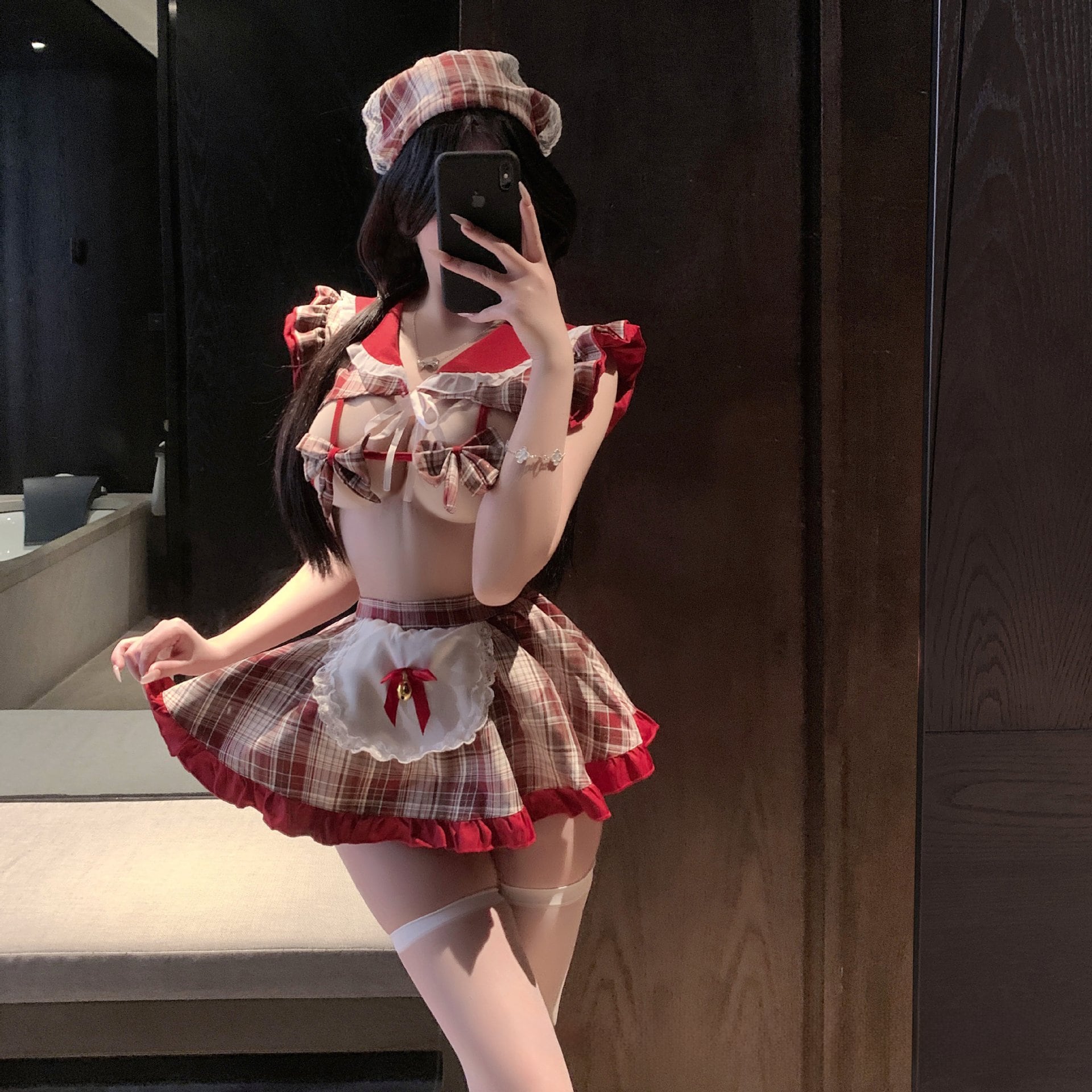 大胆オープンデザインリボン赤チェック純欲系JK風制服コスチューム|萌え系ベビードールセット