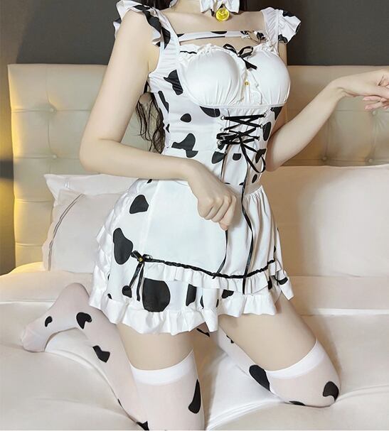大きなリボンとうさ耳カチューシャが印象的な、可愛さ満点の牛柄メイドコスチュームが登場♡