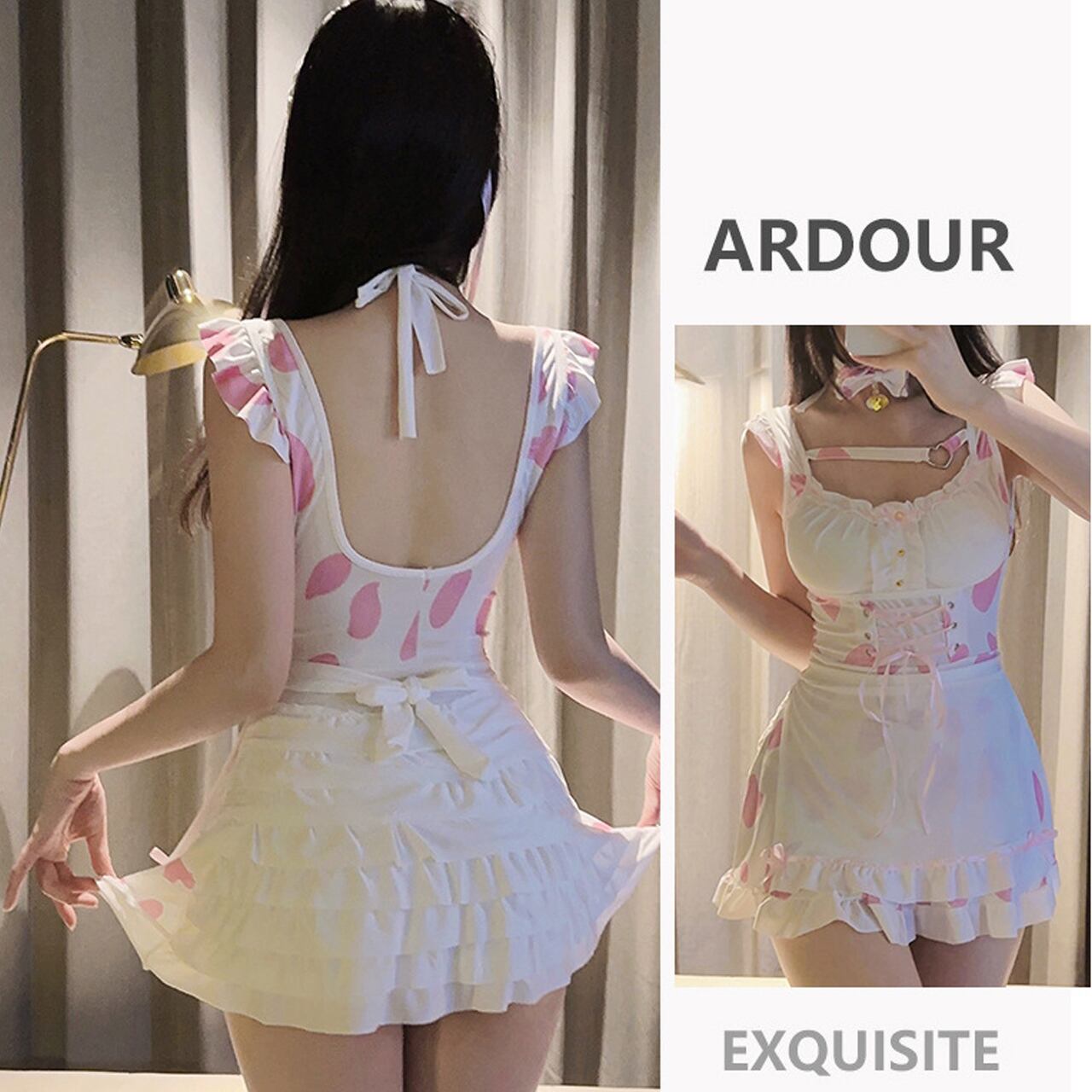 大胆な胸元とバックリボンで、女性らしいくびれを際立たせつつ、フリルとレースの甘さでバランスよく仕上げました。