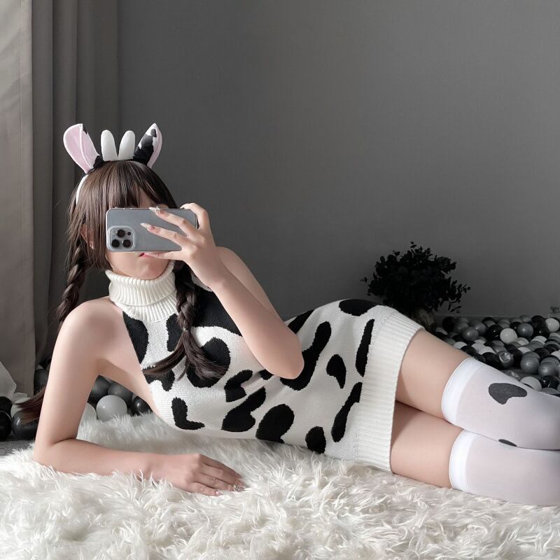 背中あきホルターネック牛柄ニットワンピース|大胆セクシー×もこもこフェチコーデ