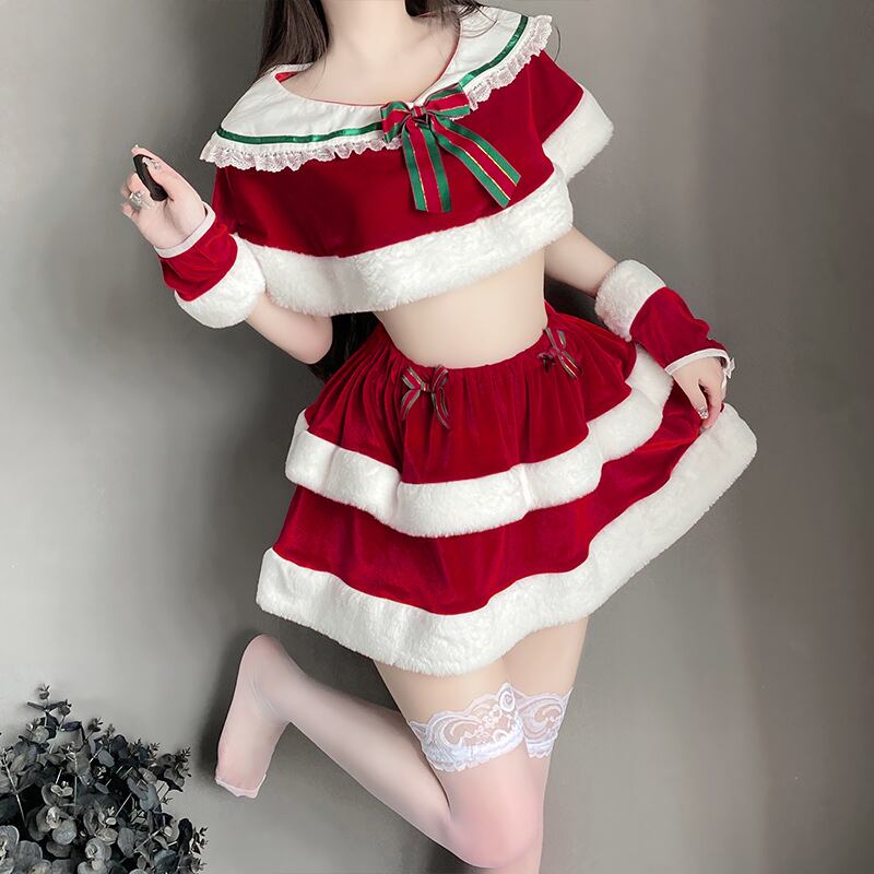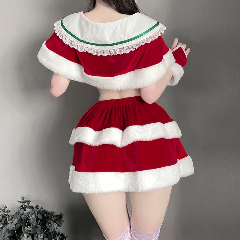 【サンタコスプレ】ふわもこサンタ コスプレ3点セット|赤×白レイヤードスカート&へそ出しトップス|クリスマス衣装