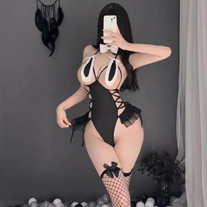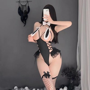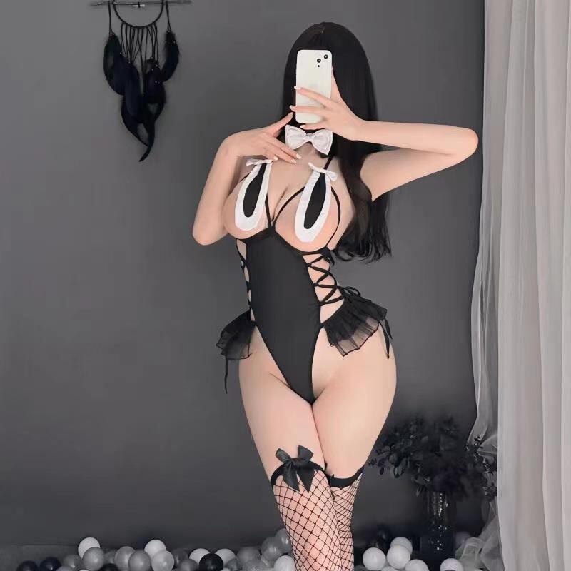 【バニーコスプレ】セクシーバニー・ブラックオープンテディ|サイド編み上げ&ふわふわ尻尾付きランジェリー
