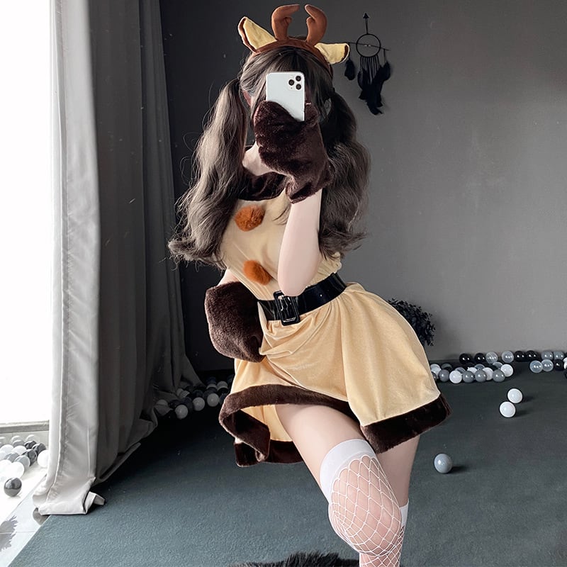 ふわもこ感が魅力の連体ワンピースに、耳付きカチューシャ・手袋・腰ベルトなどがセットになった、季節限定の癒し系デザインです。
