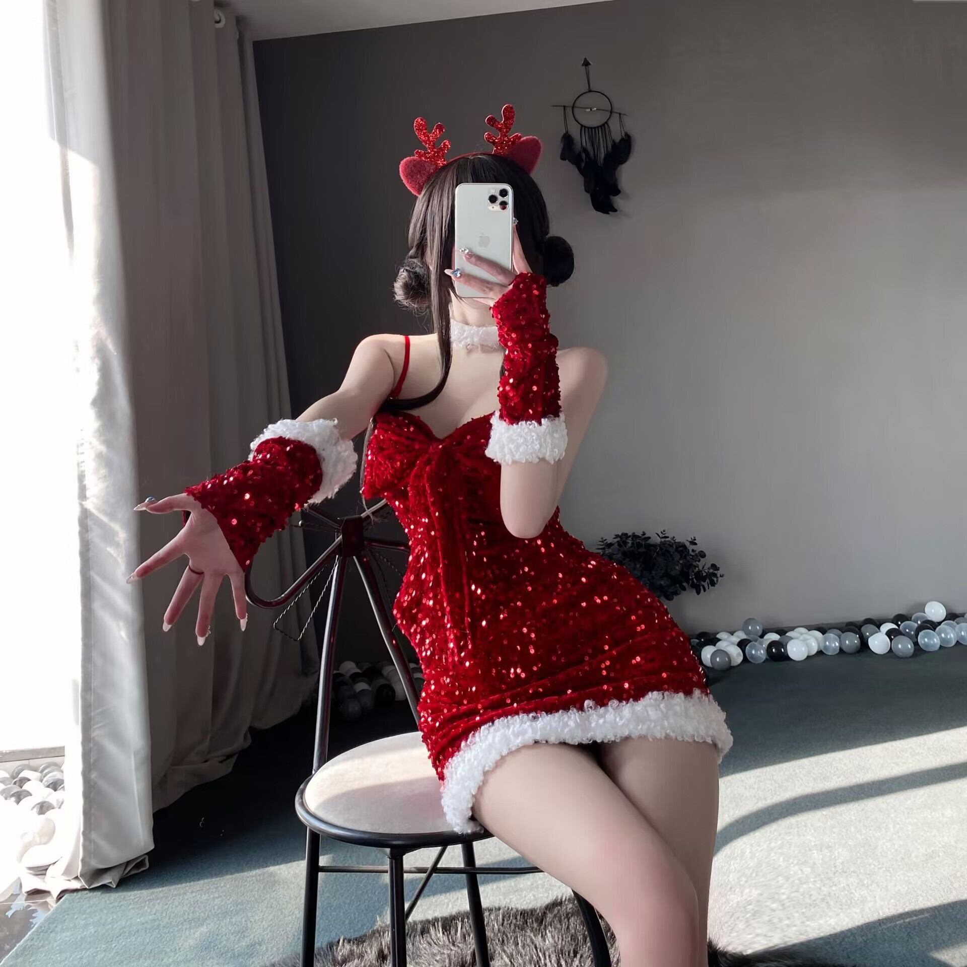 全体に散りばめられたグリッターが光を反射し、動くたびにきらきらと煌めくセクシーサンタコスチューム。