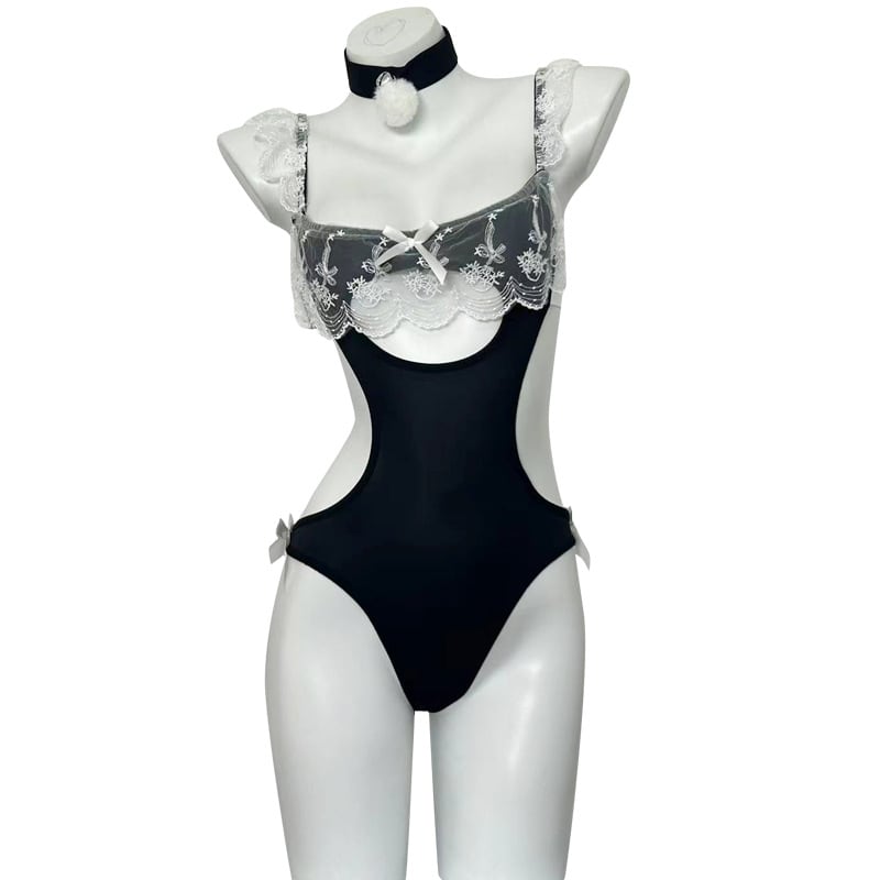 【メイドコスプレ】大人かわいいホワイトレース×ブラックメイド風スリングボディスーツ|上品セクシー・夜のおしゃれ演出に