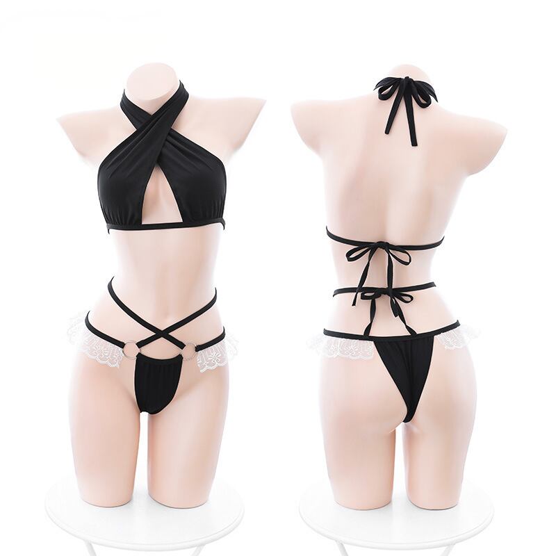 【ランジェリー】純欲クロス天使風3点セット|大人可愛いホルターブラ&セクシーストラップショーツ