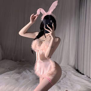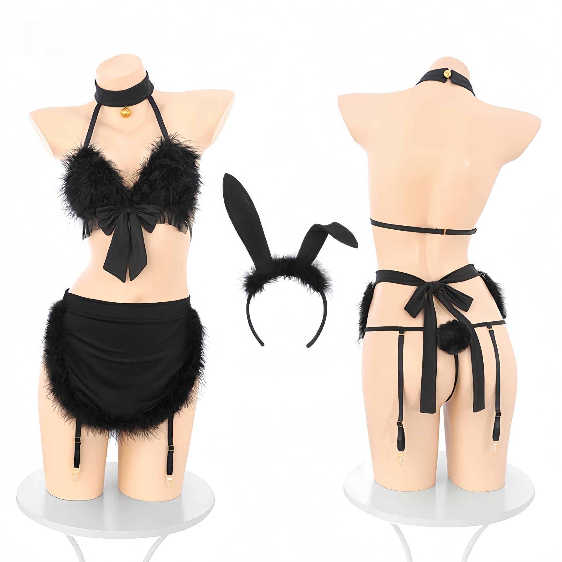 チョーカー風ネックアクセ、ガーター付きのスカート風デザイン、うさ耳カチューシャにふわふわ尻尾まで、全身で“魅せる”コスチュームです。