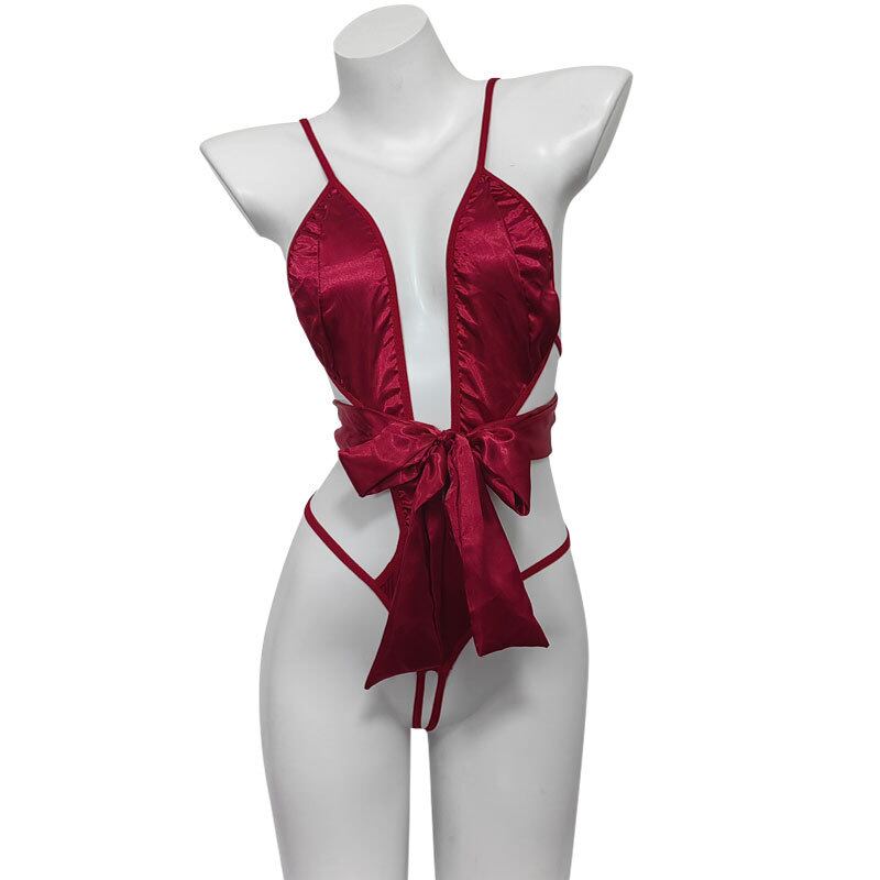 きらめくサテンリボンが贈り物のように身体を彩る、ボンデージ風デザインのセクシーランジェリーセットが登場。
