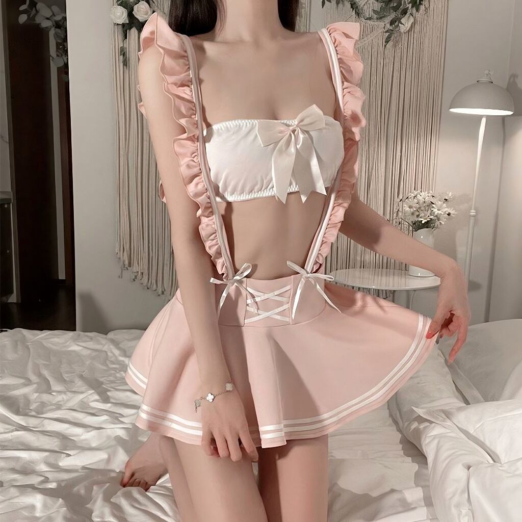 〔スクール〕フリルリボンのスイート学生風2点セット(ピンク×ホワイト)