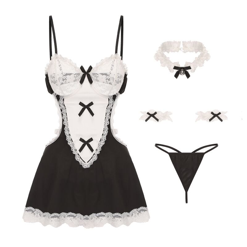 大胆な背中開きとサイドカットで魅せる、甘く小悪魔的なメイド風ランジェリーセット。ボディラインを美しく引き立てるフィット感のあるワンピースドレスは、光沢感のあるブラックサテン調の生地と、フロントの白×レース切替がコントラスト映えするデザイン。ふんわりと広がるミニ丈のスカートに、たっぷりのフリルとリボンがあしらわれ、フレンチガーリーな要素もプラス。