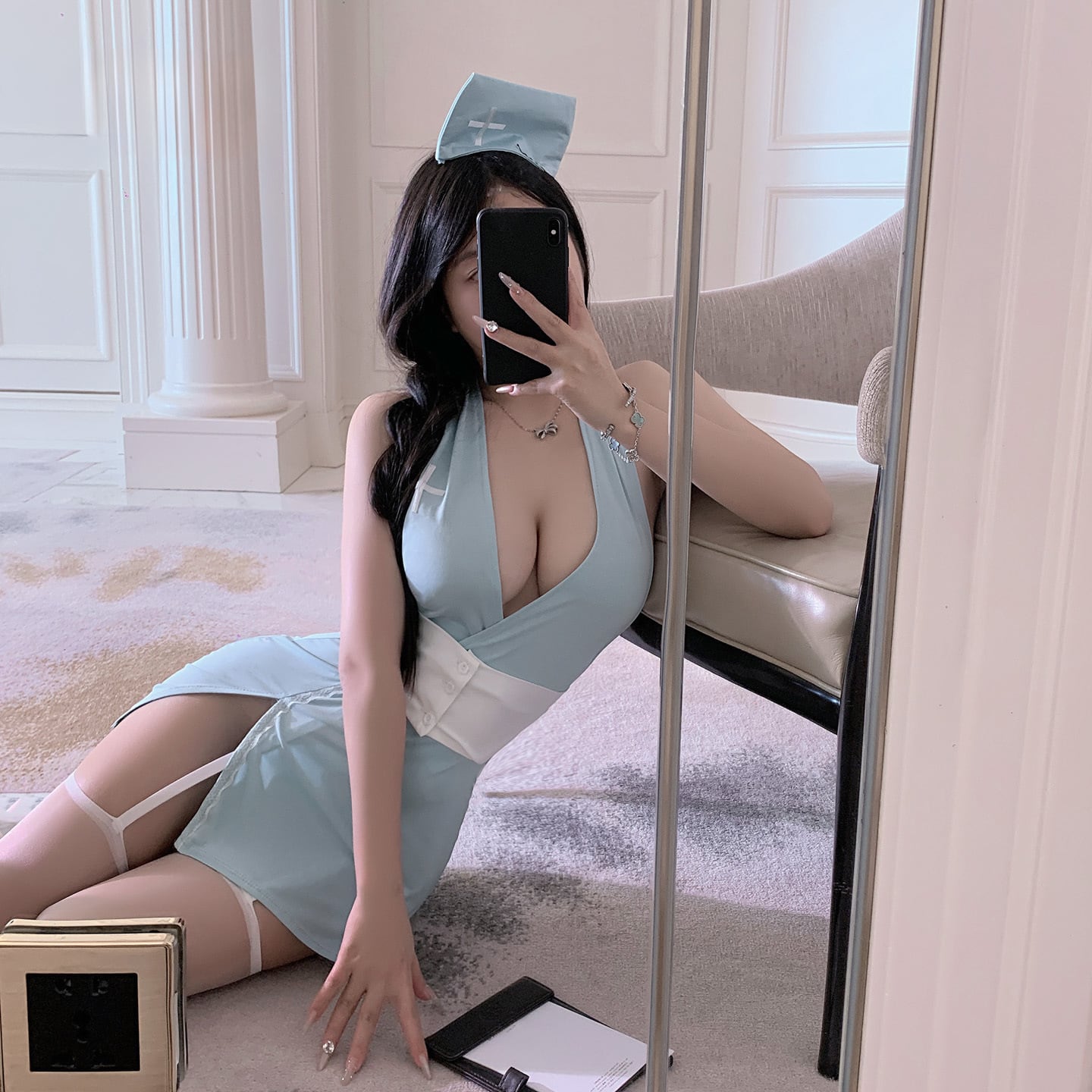 胸元セクシー×スリット ナース制服コスチューム(ブルー/ブラック)