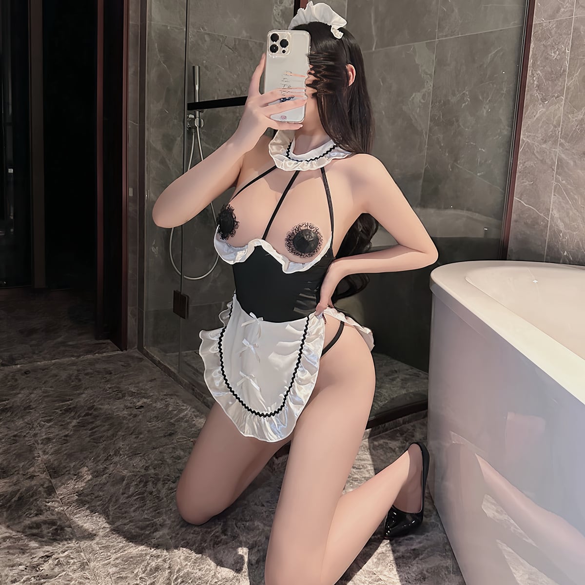 〔メイド〕クラシックフリルメイド風オープンバックランジェリーセット