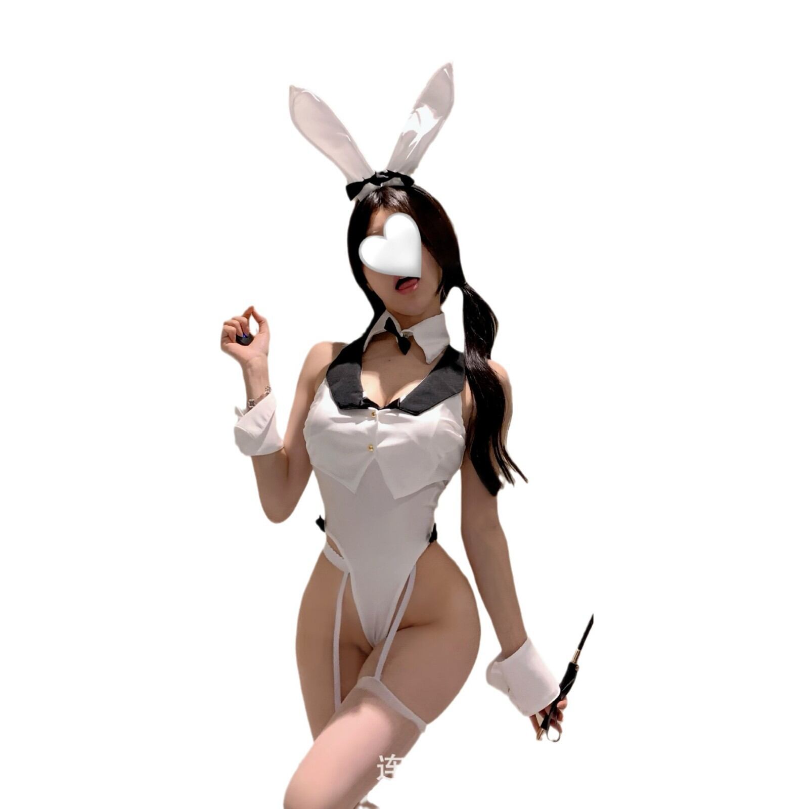 〔アニマル〕ホワイトバニーガールコスチューム6点セット|ハイレグボディスーツ×耳カチューシャ付き