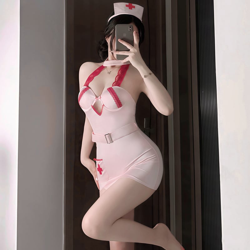 〔ナース〕ピンクナースコスチューム(ミニワンピース+ナースキャップ+ベルト)