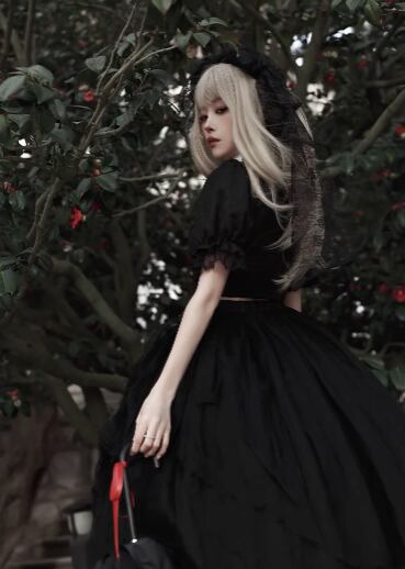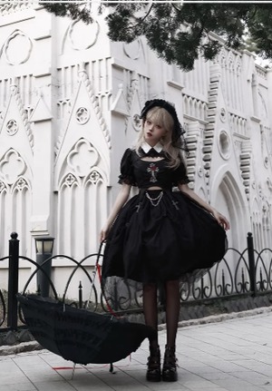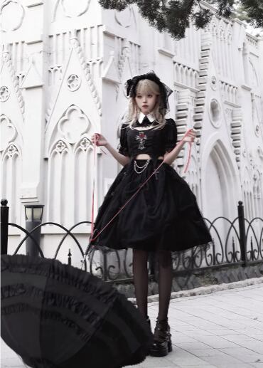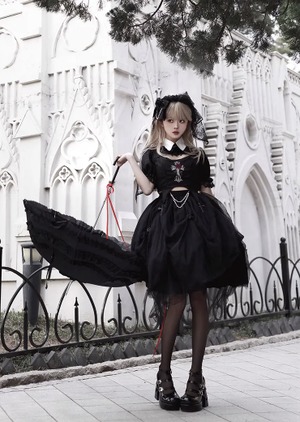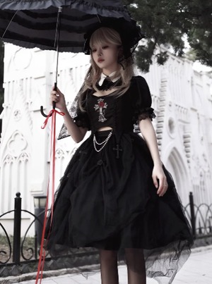 〔ロリータ〕ゴシックロリータドレスセット|クロス刺繍トップス+ブラックチュールドレス