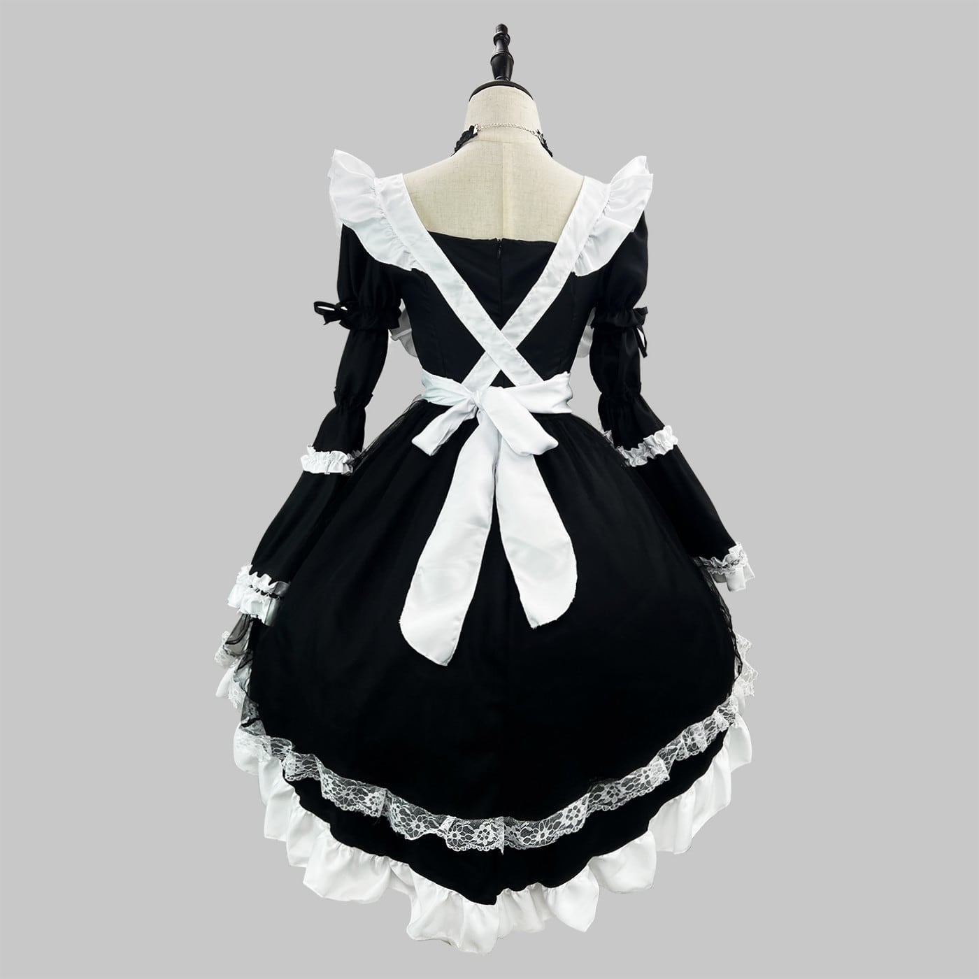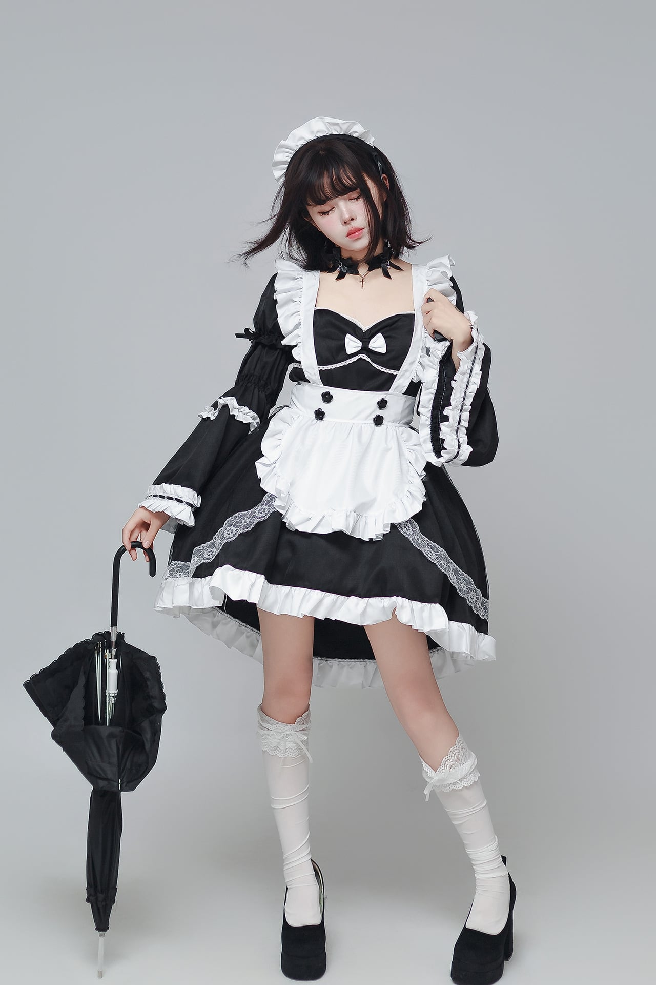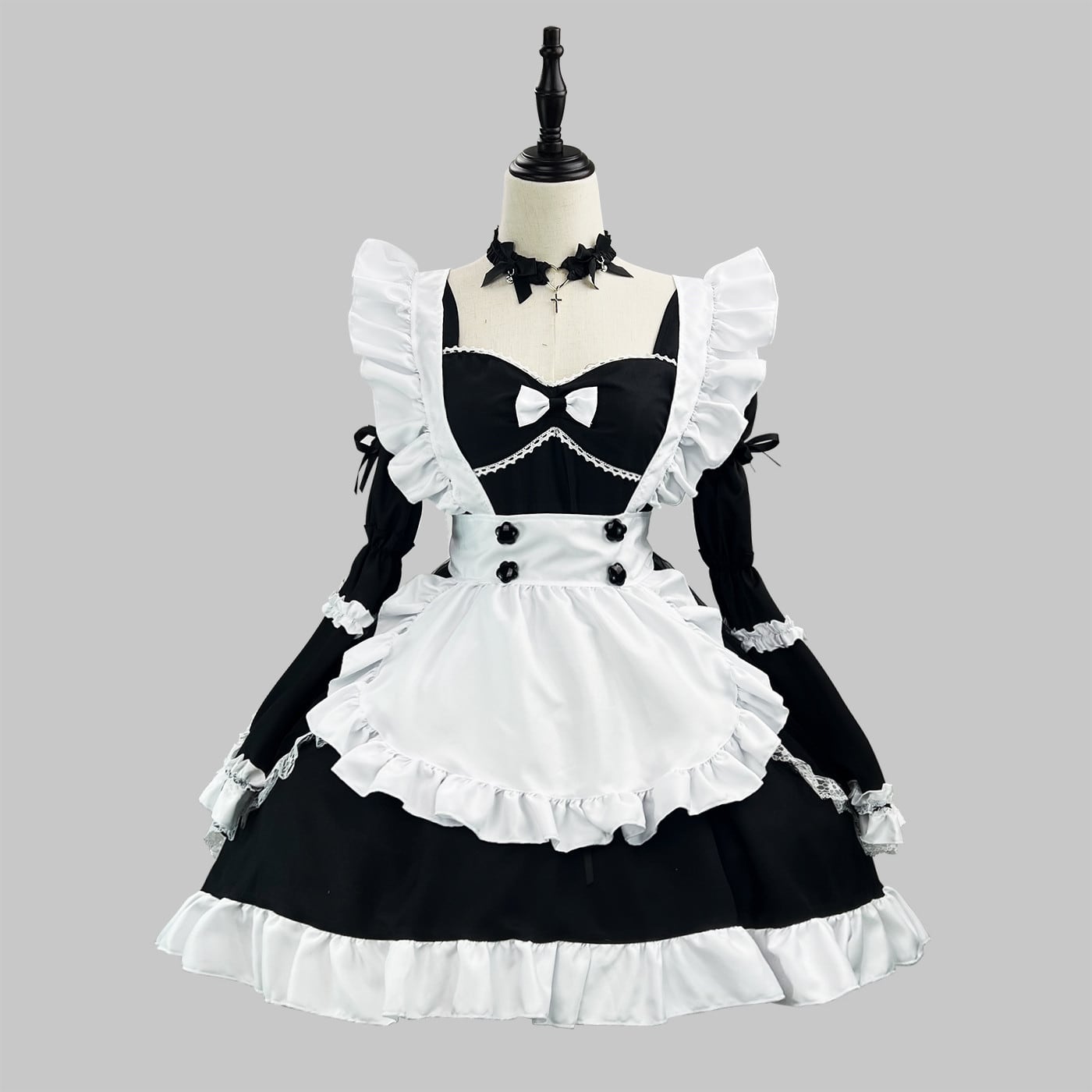 〔メイド〕クラシックメイドコスチューム|フリルエプロン付きメイドワンピース(ブラック×ホワイト)