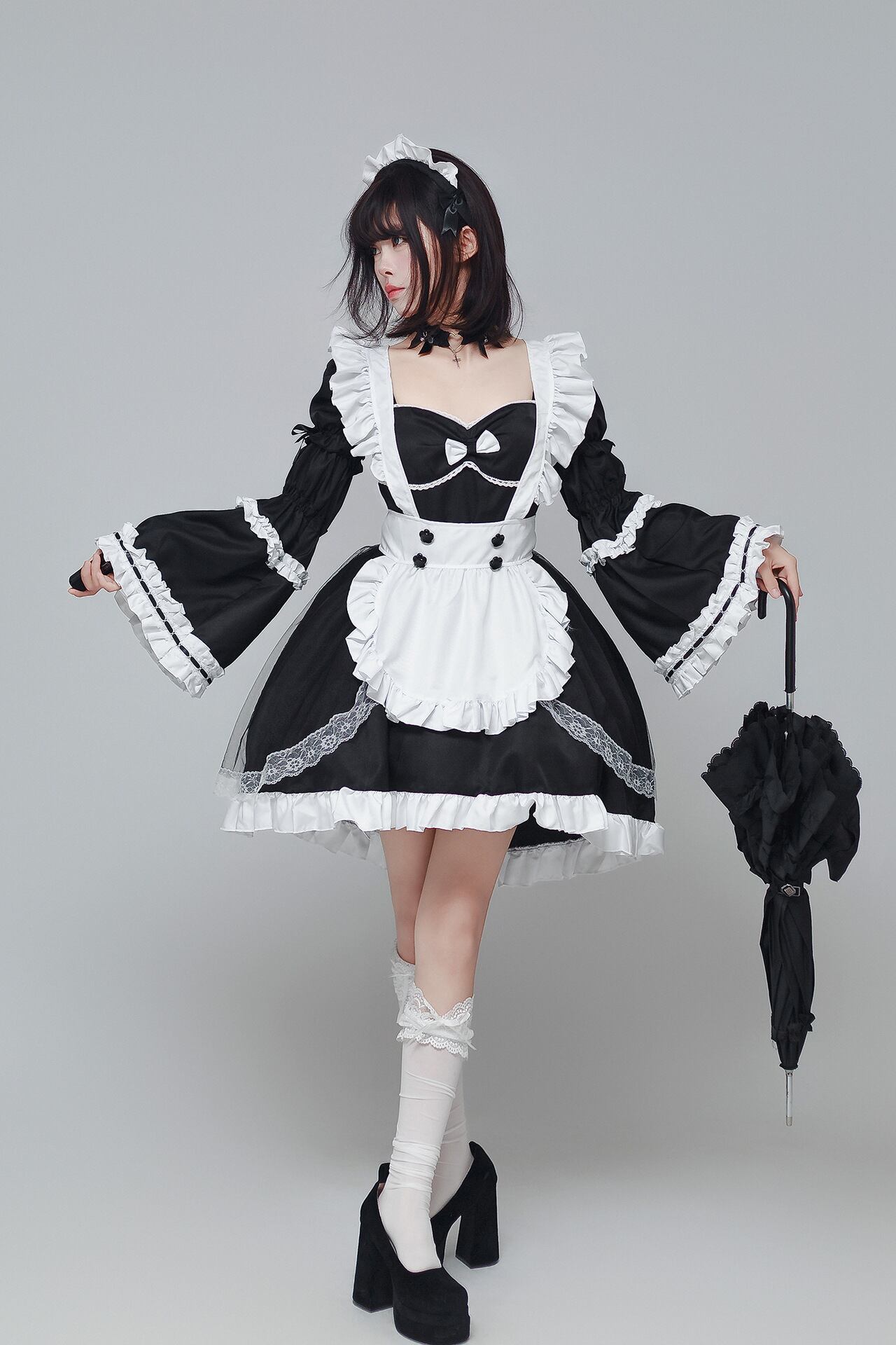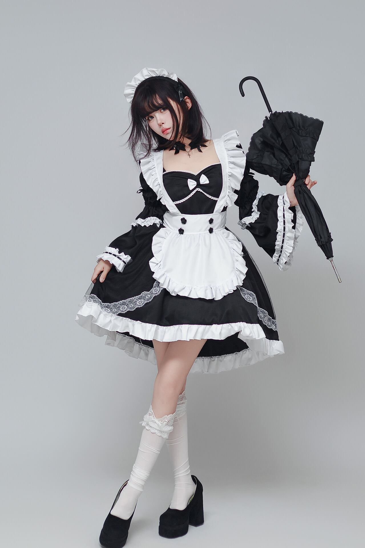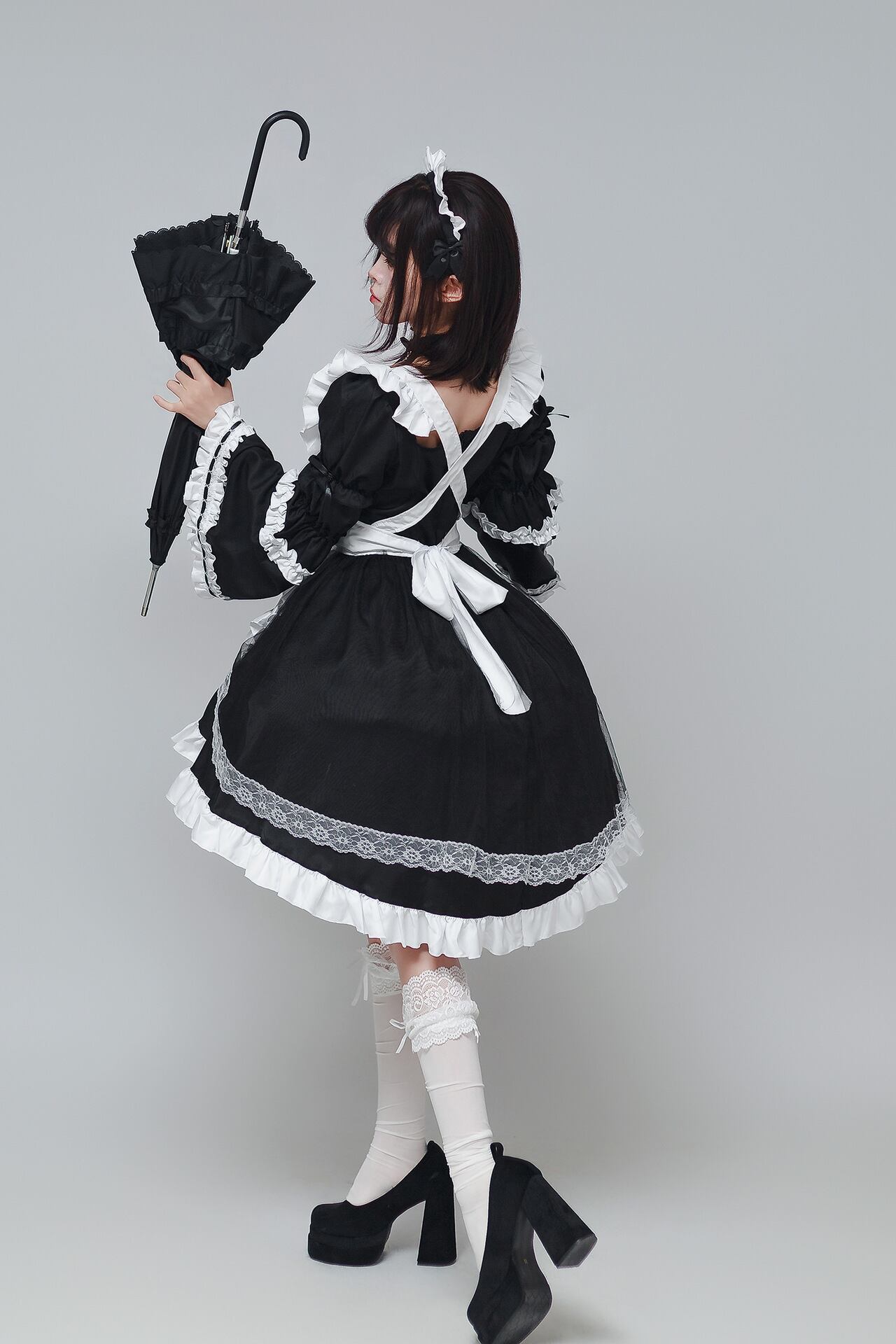 〔メイド〕クラシックメイドコスチューム|フリルエプロン付きメイドワンピース(ブラック×ホワイト)