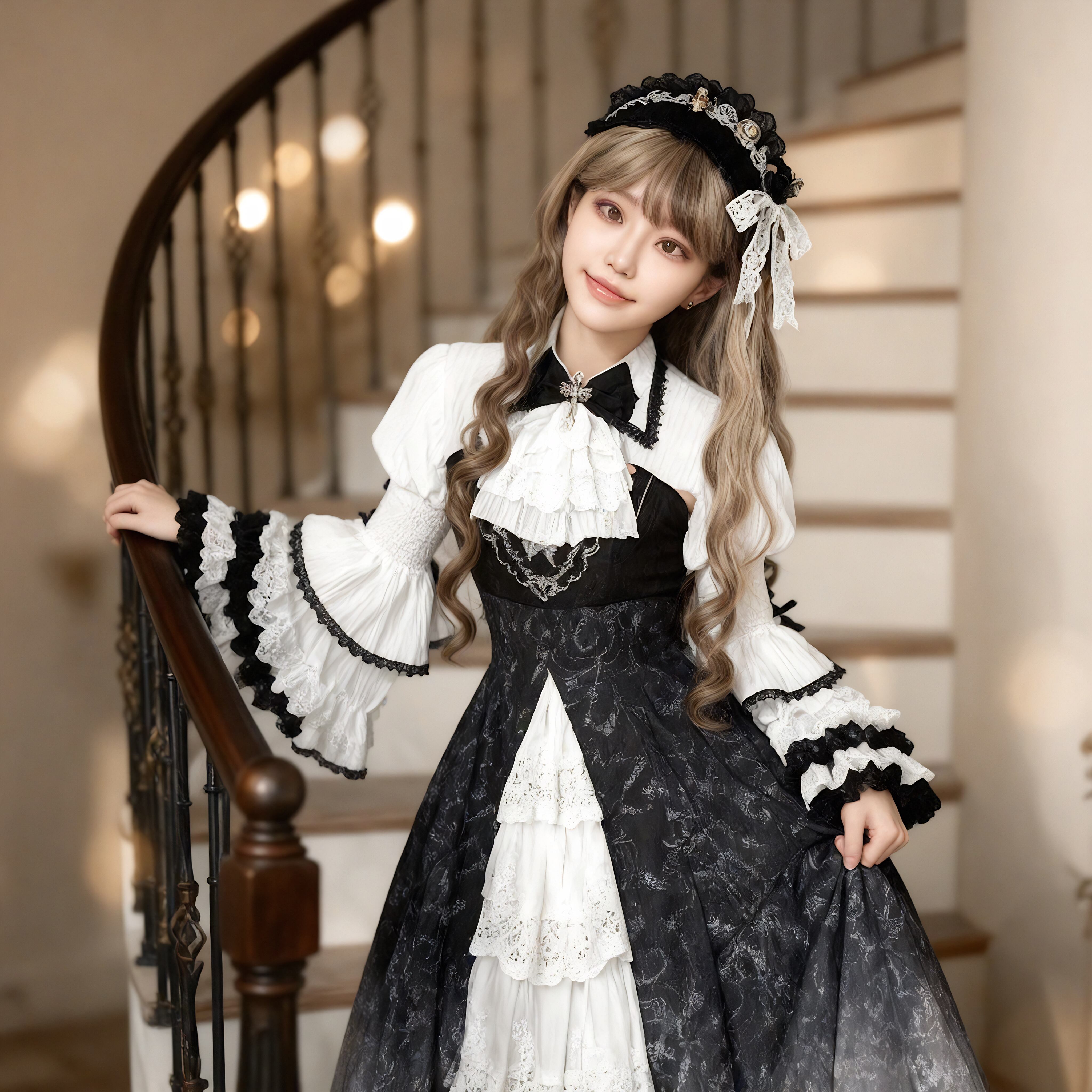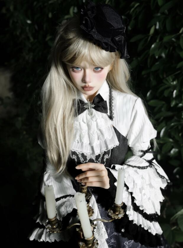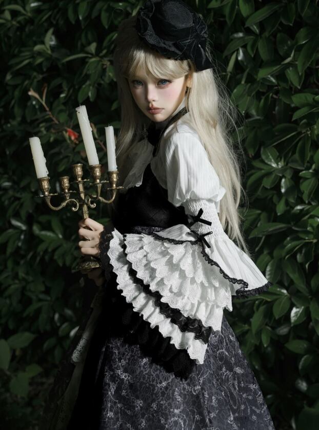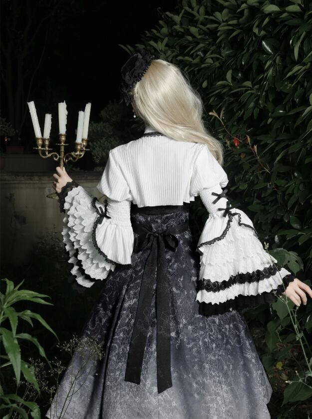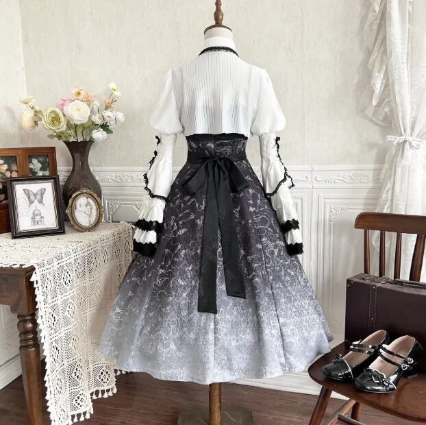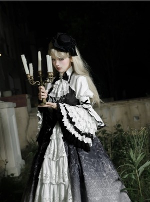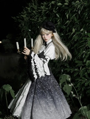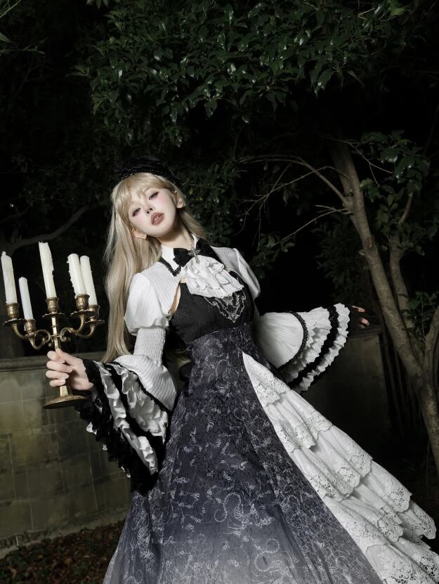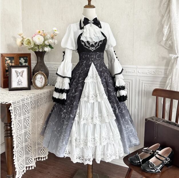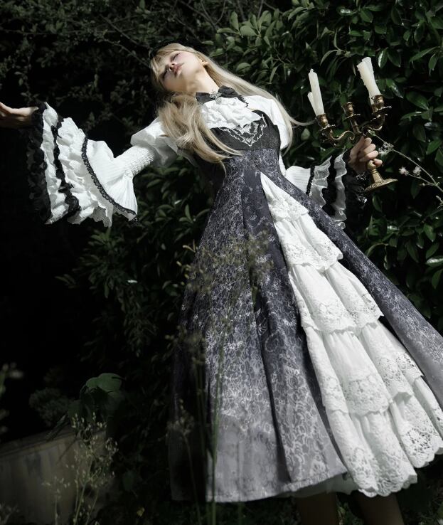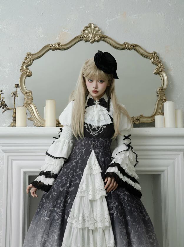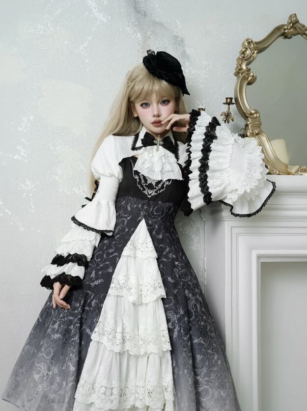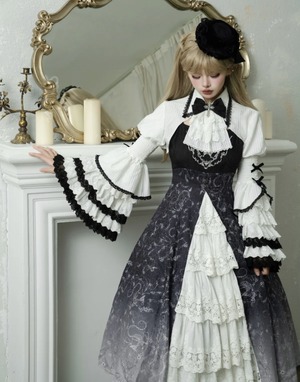 〔ロリータ〕クラシカルゴシックロリータドレスセット|フリルブラウス+レースジャンパースカート(ブラック×ホワイト)