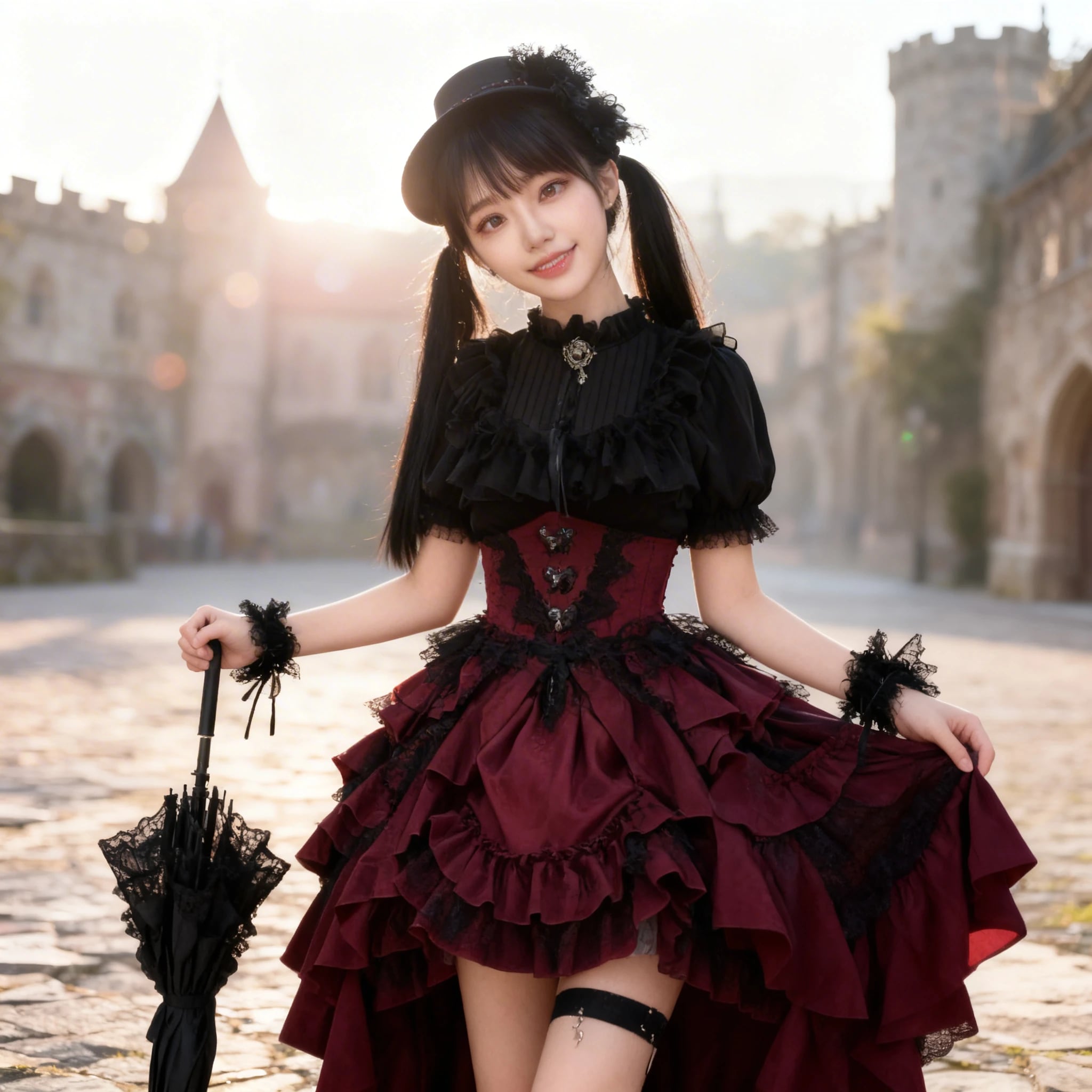 〔ロリータ〕ゴシックロリータドレスセット|ブラックトップス×ワインレッドフリルスカート ゴスロリコスチューム