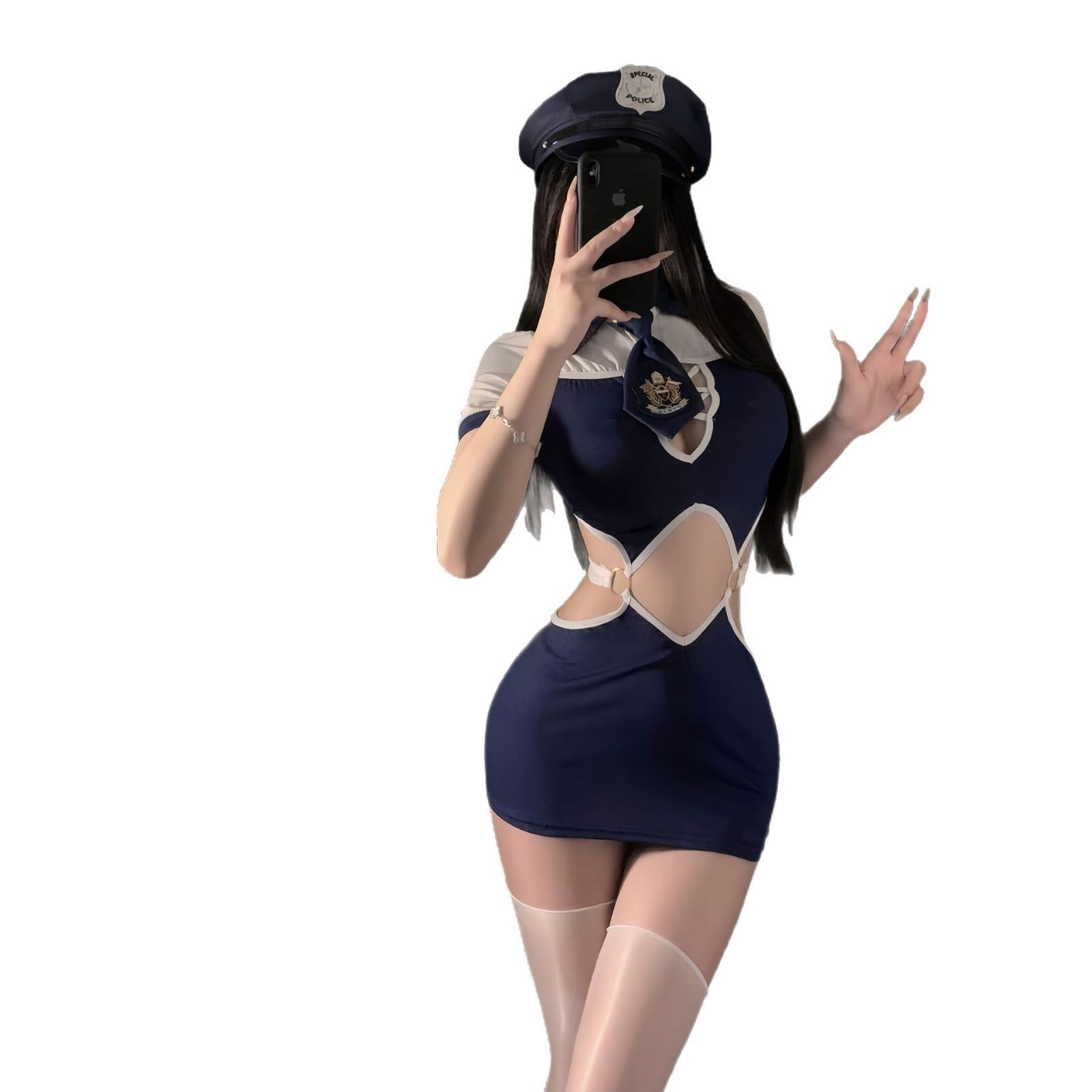 帽子付きのポリス風デザインで、コーデ全体のテーマが伝わりやすいのがポイント。小物をたくさん足さなくても雰囲気を出しやすく、ハロウィン、コスプレイベント、撮影会、パーティーなどでも取り入れやすいバランスです。強すぎず、可愛さも残したデザインなので、イベント衣装としても挑戦しやすい印象にまとまっています。