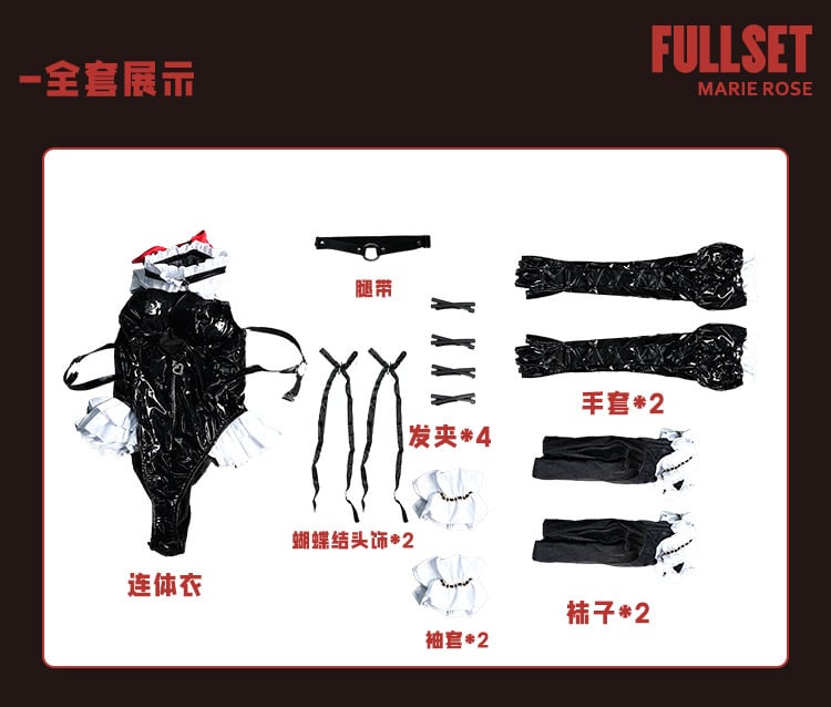 連体衣、腿帯、手套×2、袜子×2、袖套×2、蝴蝶結頭飾×2、发夹×4