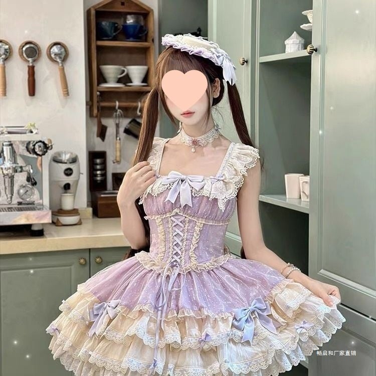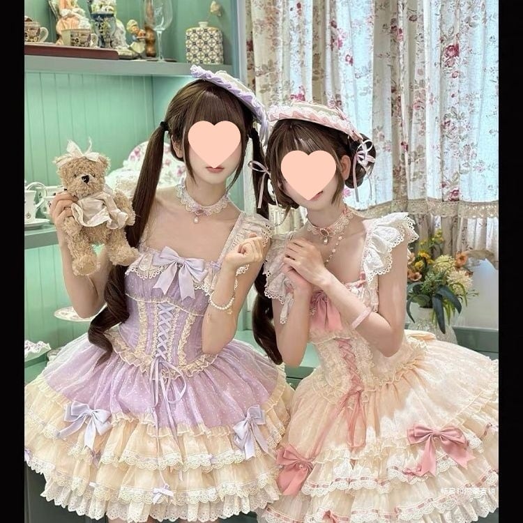 〔ロリータ〕ふわ甘ドールフリルロリータワンピース(リボン×コルセット風・選べる3カラー)