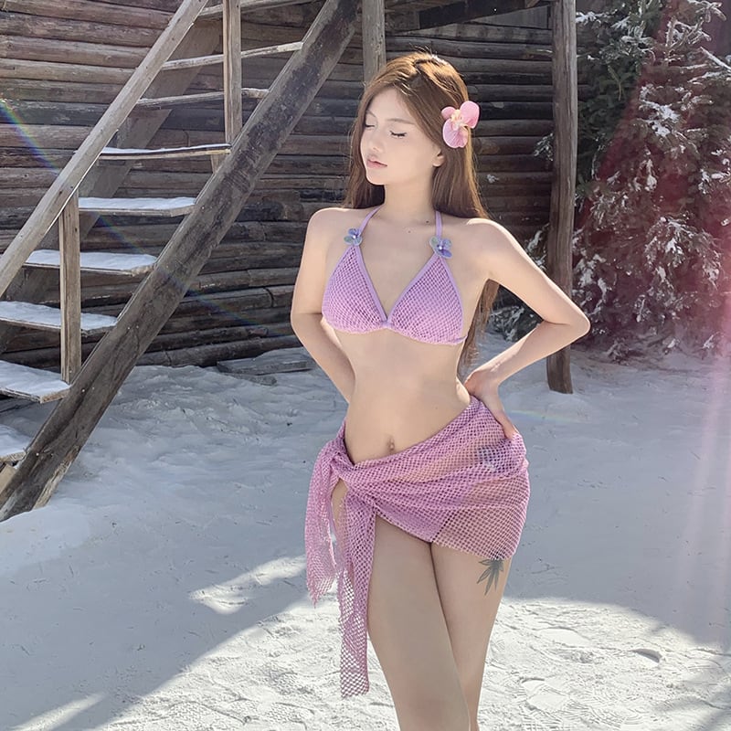 甘すぎないのに、しっかり可愛い。そんなバランスで選びたい日にぴったりのビキニです。淡いピンクをベースに、立体感のあるメッシュ風素材と小さなフラワーモチーフを合わせることで、シンプルな三角ビキニよりもやさしく華やかな印象に仕上がっています。